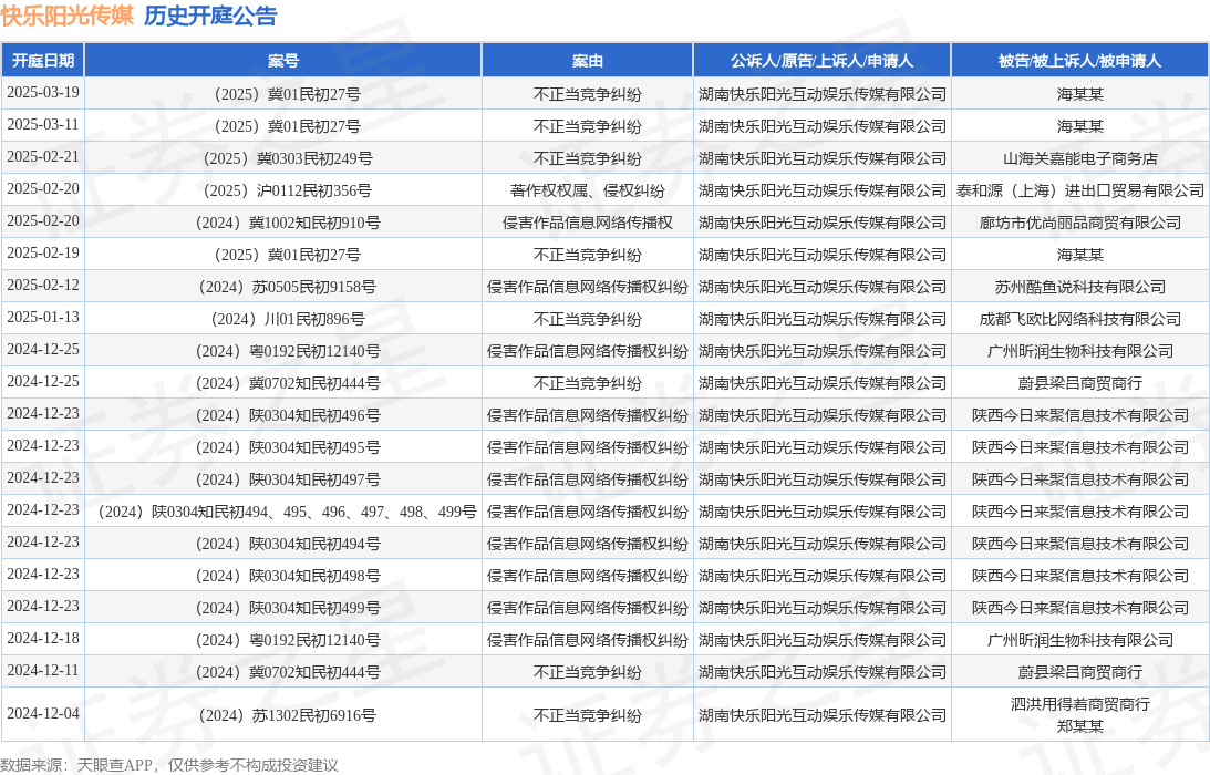 案号:(2025)冀01民初27号审理法院:河北省石家庄市中级人民法院案由:不正当竞争纠纷当事人信息: 原告/上诉人:湖南快乐阳光互动娱乐传媒有限公司 被告/被上诉人:海某某开庭日期:2025年2月19日根据统计,近一年内以湖南快乐阳光互动娱乐传媒有限公司为当事人的历史开庭公告有106则,其中案由为“不正当竞争纠纷”的公告以55则居首,其次为“侵害作品信息网络传播权纠纷”有31则,“著作权权属、侵权纠纷”有6则。历史开庭公告(前20条)如下: